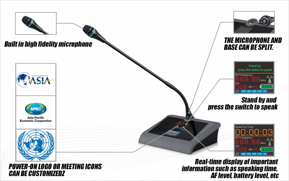 ●Digital modulation and transmission technology with random unique IDs completely avoids the risk of off-site eavesdropping on traditional wireless conferencing microphone systems using FM modulation! Ensure confidentiality in signal transmission