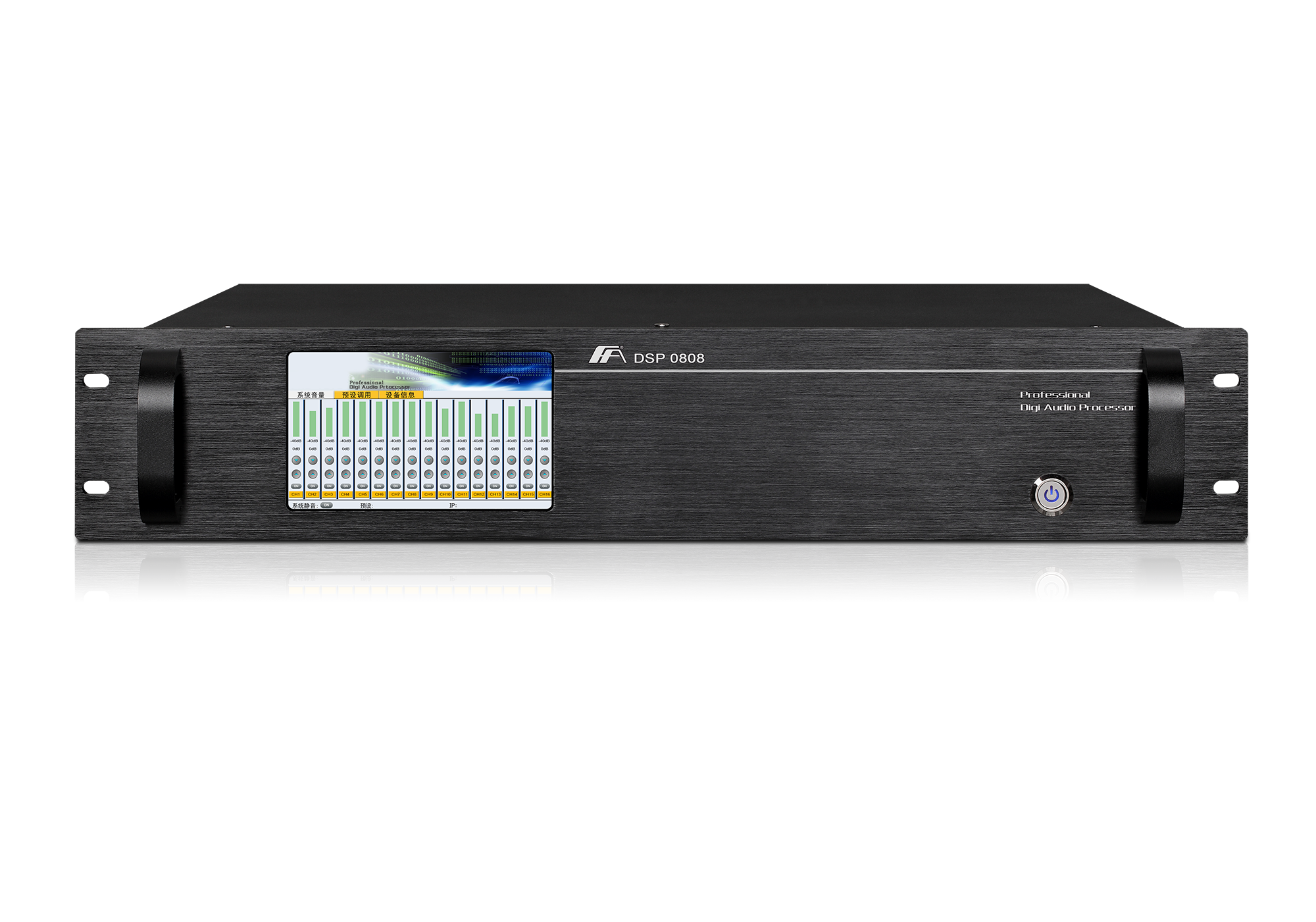 The DSP-0808 is a powerful 8-in, 8-out digital audio processor based on ADI’s SHARC 4th generation ADSP-21489 floating-point audio DSP chip, providing the highest performance 400 MHz/2200 MFLOP processor capability. Ultra-low noise floor pre-amplification circuit, low distortion analog circuit, 114dB audio AD, DA, provide high-quality sound quality for the scene. The front panel of the device must have a volume status display, which can display the volume status of all input 8 and output 8 channels; The 5″ touch screen on the front panel of the device can adjust the volume of each channel and call up 32 sound effect scenarios; Displays the current IP address of the device, the preset number currently used by the processor, and the preset name. It can be connected to the Android system via WIFI and can be operated by a smartphone or tablet. It can be connected to the Android system and supports smartphone or tablet control software package.